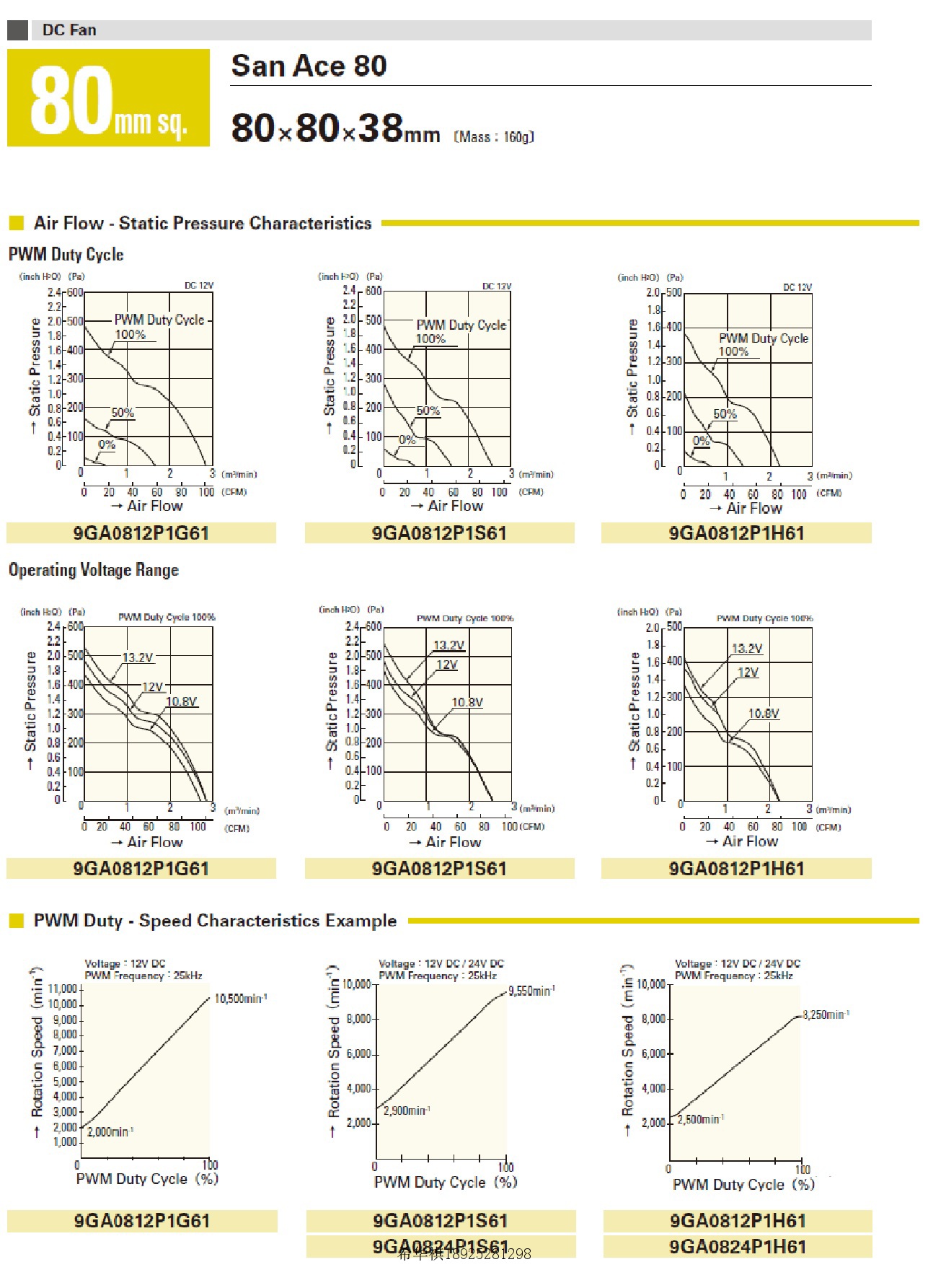 9GA0812P1G61(611) 电流1.2/0.04A 功率14.4/0.48W 转速10500/2000RPM 风量100.6/18CFM 静压480/28.7Pa 噪音值60/21DB